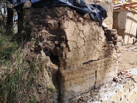 Next, the main priority was to fill in all the holes. After all, it needs to maintain as much heat as possible, and ideally not collapse either. Again, a few hours were spent inside the oven, with my helpers from the outside passing me buckets of adobe (clay and sand) and some juice to keep me going. We would have liked to do a full internal layer as there were many cracks in the original, however time was of the essence so the external insulating layer became the main priority, along with the door. The insulating layer consists of clay, sand, and straw, the straw being the insulating ingredient. It was satisfying to smooth off all the lumps and bumps of the outside for sure!